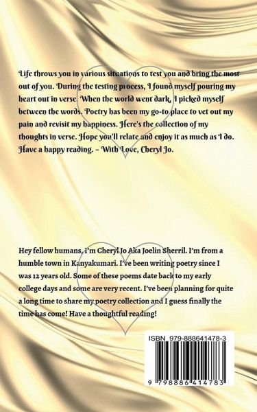 Life throws you in various situations to test you and bring the most out of you. During the testing process, I found myself pouring my heart out in verse. When the world went dark, I picked myself between the words. Poetry has been my go-to place to vet out my pain and revisit my happiness. Here's the collection of my thoughts in verse. Hope you'll relate and enjoy it as much as I do. Have a happy reading. - With Love, Cheryl Jo.