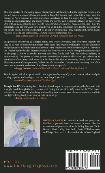 WANDERING is a debut poetry chapbook that delves into questions of myth and meaning through a multi-voice prism of broken histories, ambition, abandonment, connectivity, love and desire. These themes are explored in a five-part arc: dream making, death sequence, flood waters, earth & gravity, and re-memory material & time.