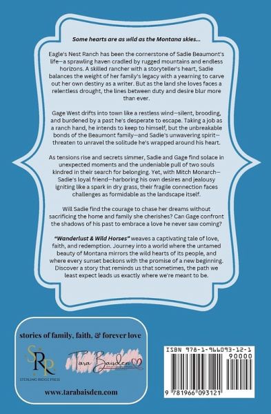 Escape to the breathtaking landscapes of Montana in this heartwarming tale of love, redemption, and finding where you truly belong. Eagle's Nest Ranch has always been Sadie Beaumont's world-a sprawling family legacy nestled in the rugged beauty of Montana. A dedicated rancher and author, Sadie grapples with the pressures of maintaining her family's traditions while yearning to pursue her own dreams. Torn between her duty and her passion for writing, her world is further complicated by a shifting relationship with her dependable friend, Mitch Monarch. When the mysterious and brooding Gage West arrives at the ranch seeking work, he brings with him a past he can't outrun, and a heart guarded by solitude. Gage intends to keep to himself, but the tight-knit Beaumont family and the unyielding spirit of Sadie begin to break down the walls he's built. As drought threatens the very existence of the ranch, tensions rise. Sadie and Gage are drawn together by unexpected moments-a shared rescue in a storm, quiet moments, and the unspoken understanding between two souls searching for their place. But with secrets looming and Mitch's jealousy escalating, their budding romance faces challenges that could tear them apart. Will Sadie find the courage to chase her own dreams without abandoning her family's heritage? Can Gage confront his past and embrace the possibility of love and belonging? Immerse yourself in "Wanderlust & Wild Horses", a captivating romance that explores the intersections of faith, family, and the transformative power of love. Discover a story where the wild beauty of the landscape mirrors the untamed hearts of its characters, and where every sunset brings the promise of a new beginning. For Readers Who Love:Opposites attract: She's the steady rancher's daughter; he's the restless drifter with a wounded heart. Small-town charm: A tight-knit community full of gossip, love, and faith. Found family themes: Bonds built on trust, resilience, and grace. Clean and faith-filled romance: A story that celebrates love, hope, and the power of second chances. If you love heartfelt stories of faith, romance, and the beauty of wide-open landscapes, Wanderlust and Wild Horses is a must-read!