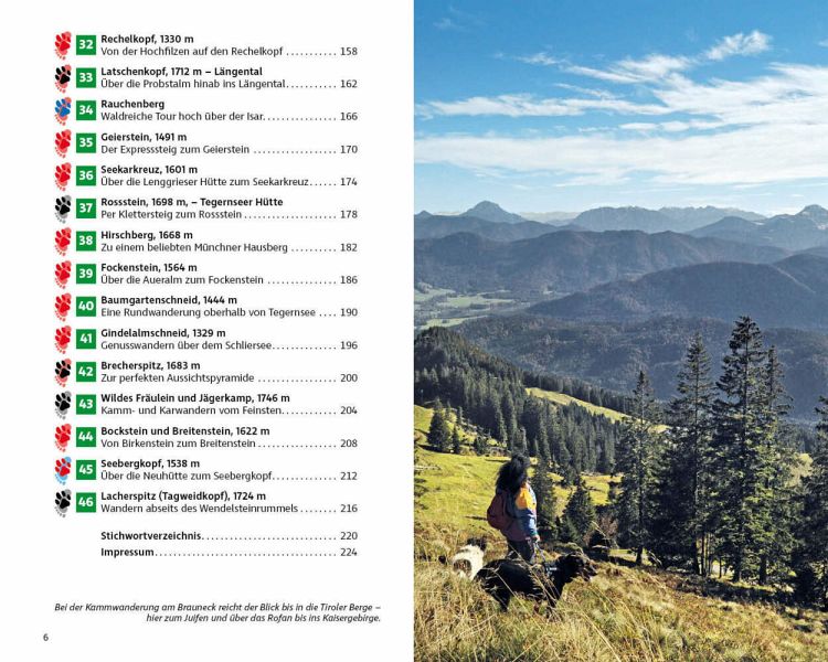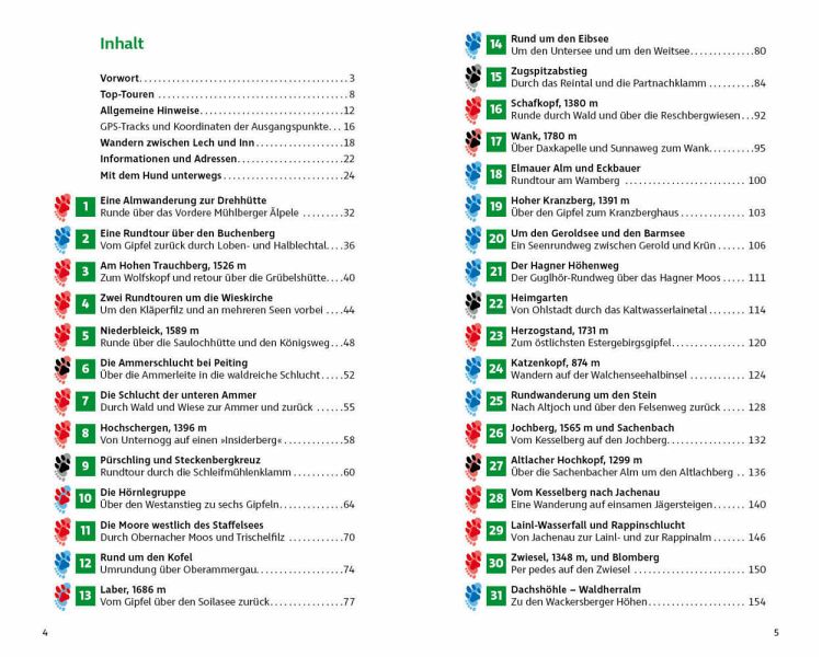 Die 46 Wanderungen im Buch sind speziell auf Hundebesitzer abgestimmt: Gehzeiten, Höhenmeter, Schwierigkeitsgrade, Wasserstellen, schattenfreie Wegstrecken, Begegnungen mit Weidevieh und heikle Passagen wie Brücken oder Stege werden ausführlich beschrieben. So kann man gezielt die ideale Wanderung für den Vierbeiner auswählen. Auch Bademöglichkeiten für Hunde werden angegeben, um an heißen Tagen für die nötige Abkühlung zu sorgen.