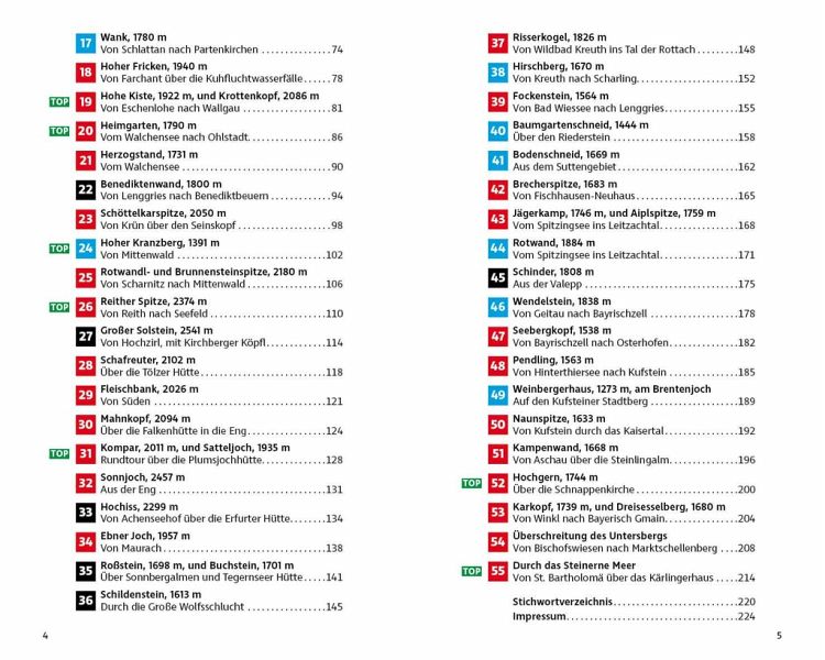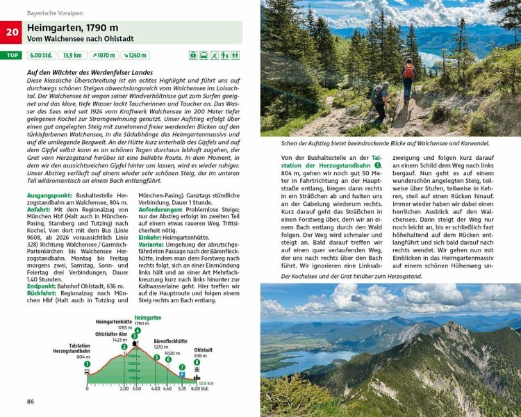 Die Spannbreite der Ziele ist groß und liegt zwischen Füssen und Berchtesgaden. Eher lieblich ist die von ausgedehnten Wäldern, beschaulichen Almen und meist sanften Gipfeln geprägte Landschaft in den Bayerischen Voralpen. Wetterstein und Karwendel bieten mit ihren Felswänden und teils schroffen Gipfeln dagegen eine deutlich »alpinere« Umgebung. Auch in den Ammergauer Alpen, im Estergebirge, im Rofan, im Kaisergebirge sowie in den Chiemgauer und Berchtesgadener Alpen werden abwechslungsreiche Touren vorgestellt. Die Schwierigkeit reicht von einfachen Wanderungen für die ganze Familie bis zum (leichten) Klettersteig, der Schwerpunkt liegt aber deutlich im mittleren Bereich.