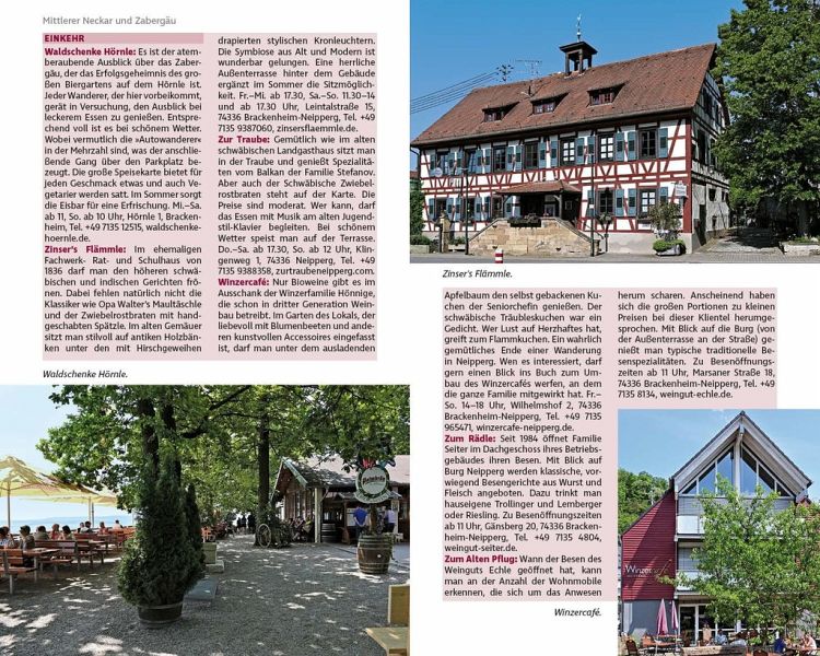 Auf genussvollen Wanderungen führt das Buch durch das Heilbronner Land, das allein schon mit seinen herrlichen Kultur- und Naturlandschaften begeistert. Im Naturpark Schwäbisch-Fränkischer Wald geht es durch unberührte Natur mit abenteuerlichen Schluchten - hier Klingen genannt -, ausgedehnten Wäldern und Seen. Eingekehrt wird in Landgasthäusern, in denen regionale Köstlichkeiten auf dem Menü stehen. Westlich des Neckars wandert man im Zabergäu auf den Schichtstufen von Stromberg und Heuchelberg durch Weinberge und Wälder. Allerorten finden sich einladende Weinlokale und urige Besenwirtschaften mit zünftiger Hausmannskost. Von den Terrassen beliebter Panoramalokale genießt man den Ausblick. Zwischen Zabergäu und Hohenlohe windet sich der Neckar durch die Keuperhügel. Hier und an den herrlichen Flusslandschaften von Kocher und Jagst ist Kulturwandern angesagt. Man kehrt in Klostergaststätten und feinen Lokalen in mittelalterlichen Kleinstädtchen ein. In den Hohenlohischen Landgasthöfen ist das würzige Fleisch vom Hällischen Schwein berühmt. Bis zum nördlich anschließenden Naturpark Neckartal-Odenwald zog sich einst der Grenzwall der Römer, der Limes. Reste seiner alten Wachtürme sind auf einigen Wanderungen zu bewundern. Hier lässt sich das Wandern bei schwäbischen Spezialitäten bestens beschließen.