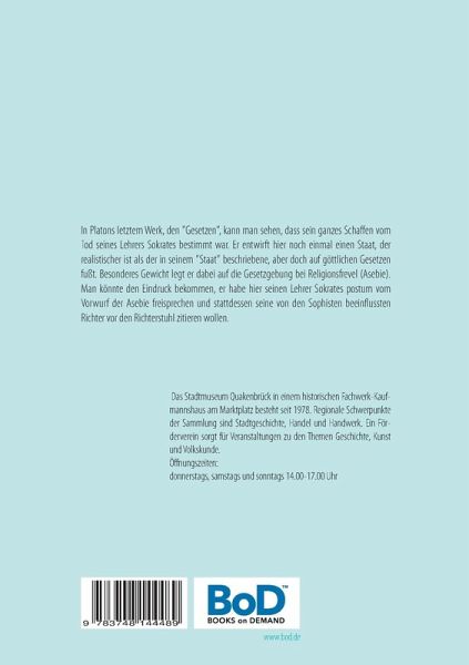 In Platons letztem Werk, den "Gesetzen", kann man sehen, dass sein ganzes Schaffen vom Tod seines Lehrers Sokrates bestimmt war. Er entwirft hier noch einmal einen Staat, der realistischer ist als der in seinem "Staat" beschriebene, aber doch auf göttlichen Gesetzen fußt. Besonderes Gewicht legt er dabei auf die Gesetzgebung bei Religionsfrevel (Asebie). Man könnte den Eindruck bekommen, er habe hier seinen Lehrer Sokrates postum vom Vorwurf der Asebie freisprechen und stattdessen seine von den Sophisten beeinflussten Richter vor den Richterstuhl zitieren wollen.