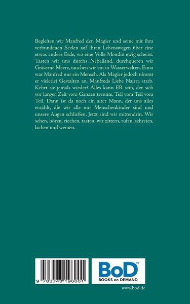 PFAD 2: Begleiten wir Manfred den Magier und seine mit ihm verbundenen Seelen auf ihren Lebenswegen über eine etwas andere Erde, wo eine Volle Mondin ewig scheint. Tasten wir uns durchs Nebelland, durchqueren wir gräserne Meere, tauchen wir ein in Wasserwelten. Einst war Manfred nur ein Mensch. Als Magier jedoch nimmt er vielerlei Gestalten an. Manfreds Liebe Nairra starb. Kehrt sie jemals wieder? Alles kann ER sein, der sich vor langer Zeit vom Ganzen trennte, Teil vom Teil vom Teil. Dann ist da noch ein alter Mann, der uns alles erzählt, die wir alle nur Menschenkinder sind und unsere Augen schließen. Jetzt sind wir mittendrin. Wir sehen, hören, riechen, tasten, wir zittern, rufen, schreien, lachen und weinen.