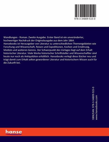 Wandlungen - Roman. Zweite Ausgabe. Erster Band ist ein unveränderter, hochwertiger Nachdruck der Originalausgabe aus dem Jahr 1864.Hansebooks ist Herausgeber von Literatur zu unterschiedlichen Themengebieten wie Forschung und Wissenschaft, Reisen und Expeditionen, Kochen und Ernährung, Medizin und weiteren Genres. Der Schwerpunkt des Verlages liegt auf dem Erhalt historischer Literatur. Viele Werke historischer Schriftsteller und Wissenschaftler sind heute nur noch als Antiquitäten erhältlich. Hansebooks verlegt diese Bücher neu und trägt damit zum Erhalt selten gewordener Literatur und historischem Wissen auch für die Zukunft bei.