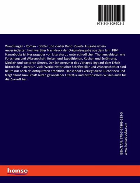 Wandlungen - Roman - Dritter und vierter Band. Zweite Ausgabe ist ein unveränderter, hochwertiger Nachdruck der Originalausgabe aus dem Jahr 1864.Hansebooks ist Herausgeber von Literatur zu unterschiedlichen Themengebieten wie Forschung und Wissenschaft, Reisen und Expeditionen, Kochen und Ernährung, Medizin und weiteren Genres. Der Schwerpunkt des Verlages liegt auf dem Erhalt historischer Literatur. Viele Werke historischer Schriftsteller und Wissenschaftler sind heute nur noch als Antiquitäten erhältlich. Hansebooks verlegt diese Bücher neu und trägt damit zum Erhalt selten gewordener Literatur und historischem Wissen auch für die Zukunft bei.