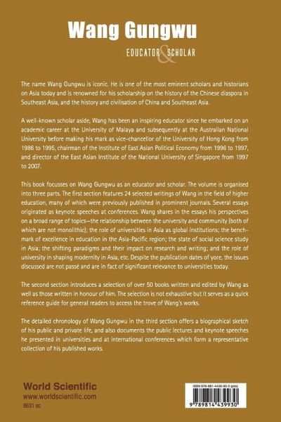 The name Wang Gungwu is iconic. He is one of the most eminent scholars and historians on Asia today and is renowned for his scholarship on the history of the Chinese diaspora in Southeast Asia, and the history and civilisation of China and Southeast Asia. His prolific works and copious contributions to journals and as book chapters are a testament to his internationally recognised expertise in East Asian and Southeast Asian area studies. A well-known scholar aside, Wang has also been an inspiring educator since he embarked on an academic career at the University of Malaya and subsequently at the Australian National University as well as a successful administrator when he became Vice-Chancellor of the University of Hong Kong from 1986 to 1995, Chairman of the Institute of East Asian Political Economy from 1996 to 1997, and Director of the East Asian Institute of the National University of Singapore from 1997 to 2007. This book focuses on Wang Gungwu as an educator and scholar. The volume is organised into three parts. The first section highlights the writings of Wang in the field of higher education. There are 24 selected articles in this collection, many of which were previously published in prominent journals. Several essays originated as keynote speeches at conferences. Spanning over a period of more than three decades from 1971 (when he was with the Australian National University) to 2008 (when he was with the East Asian Institute), Wang shares in the essays his perspectives on a broad range of topics the relationship between the university and community (both of which are not monolithic); the role of universities in Asia as global institutions; the benchmark of excellence in education in the Asia-Pacific region; the state of social science study in Asia; the shifting paradigms and their impact on research and writing; and the role of university in shaping modernity in Asia, etc. Despite the publication dates of yore, the issues discussed are not pass and are in fact of significant relevance to universities today. The second section contains a selection of over 50 books written and edited by Wang as well as those written in honour of him. The selection is not exhaustive but it serves as a quick reference guide for general readers to access the trove of Wang's works on Chinese diaspora and overseas Chinese; Chinese culture, history and civilisation; Chinese trade; maritime China; China's ideological battles; the Chinese Communist Party; China's political economy; China's reform; China's external relations; China and the new international order; Chinese world order; migration; nation-building; Hong Kong; Malaya; Malaysia; and, the Iraq War, etc. The third section provides a detailed chronology of Wang Gungwu's life and his illustrious academic career. Born in Java, brought up in what was then British Malaya, and having lived under Dutch and British colonial administration, the Japanese occupation, the Chinese revolution and the newly independent countries of Malaysia and Singapore, Wang's extraordinary set of experiences have enriched his writings as one of the leading historians of China and the doyen of scholarship on the Chinese communities of Southeast Asia.