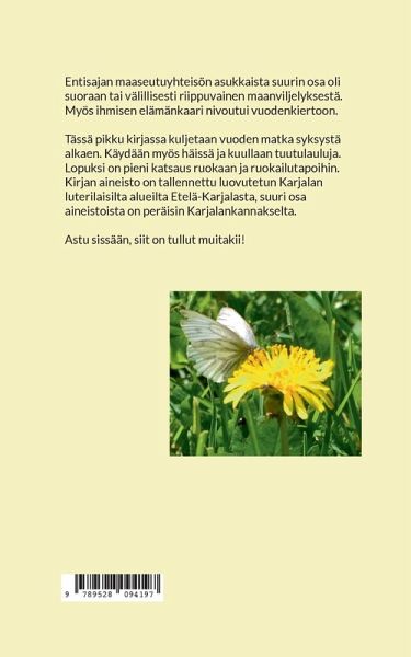 Entisajan maaseutuyhteisön asukkaista suurin osa oli suoraan tai välillisesti riippuvainen maanviljelyksestä. Myös ihmisen elämänkaari nivoutui vuodenkiertoon. Tässä pikku kirjassa kuljetaan vuoden matka syksystä alkaen. Käydään myös häissä ja kuullaan tuutulauluja. Lopuksi on pieni katsaus ruokaan ja ruokailutapoihin. Kirjan aineisto on tallennettu luovutetun Karjalan luterilaisilta alueilta Etelä-Karjalasta, suuri osa aineistoista on peräisin Karjalankannakselta. Astu sissään, siit on tullut muitakii!