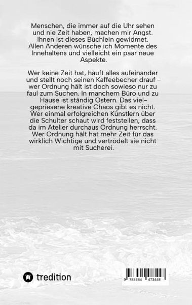 Menschen, die immer auf die Uhr sehen und nie Zeit haben, machen mir Angst. Ihnen ist dieses Büchlein gewidmet. Allen Anderen wünsche ich Momente des Innehaltens und vielleicht ein paar neue Aspekte.Wer keine Zeit hat, häuft alles aufeinander und stellt noch seinen Kaffeebecher drauf - wer Ordnung hält ist doch sowieso nur zu faul zum Suchen. In manchem Büro und zu Hause ist ständig Ostern. Das vielgepriesene kreative Chaos gibt es nicht. Wer einmal erfolgreichen Künstlern über die Schulter schaut wird feststellen, dass da im Atelier durchaus Ordnung herrscht. Wer Ordnung hält hat mehr Zeit für das wirklich Wichtige und vertrödelt sie nicht mit Sucherei.Zeit und Ordnung hängen eng zusammen, im Arbeitsalltag ebenso wie zu Hause. Wer keine Ordnung hat, sucht sich dusselig nach seinen Unterlagen oder Socken. Erfahrungsgemäß ist es ein Märchen, wenn Jemand erzählt, er oder sie fände die jeweilige gesuchte Unterlage oder Socke sofort und auf Anhieb in den vielen Stapeln auf dem Schreibtisch und Stühlen rundherum.