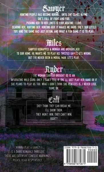 Sawyer Hunting people has become boring...until she comes along. She's full of fight and fire. Pushing her to her limits is exhilarating. I love scaring her. Hurting her. Hunting her. It makes me hard. She's our little toy, and the game has just begun. And what a fun game it is to play. Miles Sawyer kidnapped a woman and brought her to our home. He wants me to play his twisted games. It's wrong, but I've never been a moral man. Let's play. Ryder The woman Sawyer brought us is an infuriating wild card. Only, I can't tell if she'll just play her hand or if she plans to play us too. What I don't think she realizes is...I never lose. Game on. Cali They think they can break me. I'll show them. They won't win. They can't win. Right? Wanna Play a Game is a dark romance thriller. There are extensive content warnings. Please read responsibly.