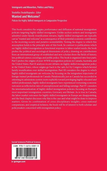 This book considers the origins, performance and diffusion of national immigration policies targeting highly skilled immigrants. Unlike asylum seekers and immigrants admitted under family reunification streams, highly skilled immigrants are typically cast as "wanted and welcome" as a consequence of their potential economic contribution to the receiving society and putative assimilability. Testing the degree to which this assumption holds is the principle aim of this book. In contrast to publications which see highly skilled immigration as functional response to labor market needs, the book probes the political and sociological dimensions of policy, drawing on contributions from an international group of established and new scholars from the fields of history, law, political science, sociology, and public policy. The book is organized into four parts. Part I probes the origins of post-WWII immigration policies in Canada, Australia, and the United States. Part II analyzes recent debates on highly skilled immigration policy in the United States, whose origins go back to the 1965 Act by Congress which favored family reunification over skilled immigration. Part III considers the degree to which highly skilled immigrants are welcome, by focusing on the integration trajectories of foreign trained professionals in Canada. Paradoxically, just as Canada has succeeded in orienting its admissions system more explicitly toward privileging highly educated and skilled professionals, highly skilled immigrants have experienced worsening economic outcomes as reflected in rates of unemployment and falling earnings. Part IV considers the internationalization of highly skilled immigration policies, focusing on Europe's most important immigration countries, Germany and Britain. As is true in Canada, the labor market outcomes for highly skilled immigrants in Europe are disappointing, and the final chapter discusses why this is the case and what might be done to improvematters. Given its combination of cross-disciplinary insights, cross-national comparisons, and empirical richness, the book will be of interest to both scholars and policymakers concerned with immigration policy.