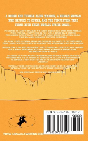 A rough and tumble alien warden, a curvy human woman who refuses to be cowed, and the temptation that turns both their worlds upside down... I've worked so hard to establish the human-Zabrian mail-order bride program. I think I've done a pretty good job, too. Until a bombshell gets dropped: The ranching outpost planet I've sent the human brides to is a penal colony. Their new alien husbands? Convicted murderers. In a panic, I rush to Zabria Prinar One to ensure the safety of the three brides. There, I come face-to-face with the arrogant (and astoundingly hot) alien warden. Warden Tenn is the most infuriatingly cocky adversary I ever could have imagined. He's a brash, swaggering male who seems to delight in bending rules... And breaking down my walls. He offers to take me into the neighbouring province to meet the other unmarried men. It's an attempt to persuade me to allow the bride program to continue. I don't trust him one bit as our rustic road trip gets underway. Especially since his eyes grow white and hungry when he looks at me. Especially since his voice softens to warm smoke when he speaks to me. And especially since he only brought one tent.