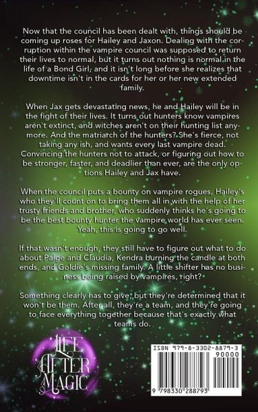 Now that the council has been dealt with, things should be coming up roses for Hailey and Jaxon. Dealing with the corruption within the vampire council was supposed to return their lives to normal, but it turns out nothing is normal in the life of a Bond Girl, and it isn't long before she realizes that downtime isn't in the cards for her or her new extended family. When Jax gets devastating news, he and Hailey will be in the fight of their lives. It turns out hunters know vampires aren't extinct, and witches aren't on their hunting list anymore. And the matriarch of the hunters? She's fierce, not taking any ish, and wants every last vampire dead. Convincing the hunters not to attack, or figuring out how to be stronger, faster, and deadlier than ever, are the only options Hailey and Jax have. When the council puts a bounty on vampire rogues, Hailey's who they'll count on to bring them all in with the help of her trusty friends and brother, who suddenly thinks he's going to be the best bounty hunter the vampire world has ever seen. Yeah, this is going to go well. If that wasn't enough, they still have to figure out what to do about Paige and Claudia, Kendra burning the candle at both ends, and Goldie's missing family. A little shifter has no business being raised by vampires, right? Something clearly has to give, but they're determined that it won't be them. After all, they're a team, and they're going to face everything together because that's exactly what teams do.