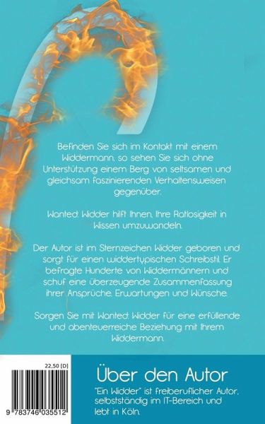 Befinden Sie sich im Kontakt mit einem Widdermann, so sehen Sie sich ohne Unterstützung einem Berg von seltsamen und gleichsam faszinierenden Verhaltensweisen gegenüber. "Wanted: Widder" hilft Ihnen, Ihre Ratlosigkeit in Wissen umzuwandeln. Der Autor ist im Sternzeichen Widder geboren und sorgt für einen widdertypischen Schreibstil. Er befragte hunderte von Widdermännern und schuf eine überzeugende Zusammenfassung ihrer Ansprüche, Erwartungen und Wünsche. Sorgen Sie mit "Wanted: Widder" für eine erfüllende und abenteuerreiche Beziehung mit Ihrem Widdermann.