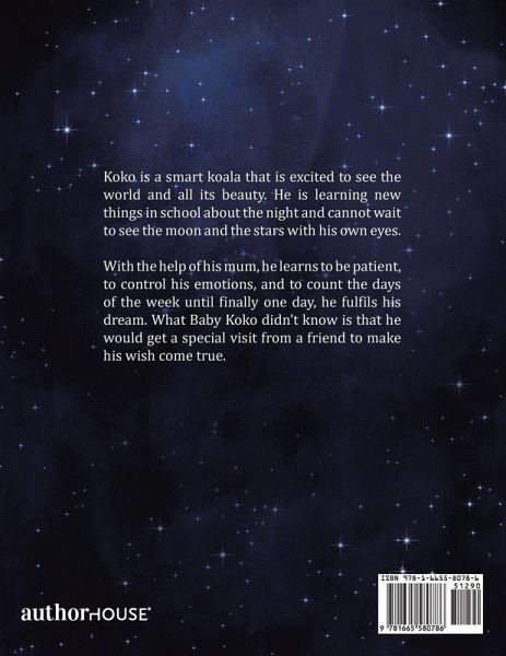 Koko is a smart koala that is excited to see the world and all its beauty. He is learning new things in school about the night and cannot wait to see the moon and the stars with his own eyes. With the help of his mum, he learns to be patient, to control his emotions, and to count the days of the week until finally one day, he fulfils his dream. What Baby Koko didn't know is that he would get a special visit from a friend to make his wish come true.