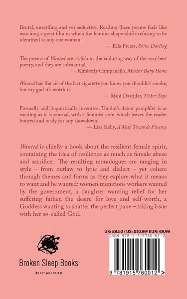 ¿¿Wanted is chiefly a book about the resilient female spirit, containing the idea of resilience as much as female abuse and sacrifice. The resulting monologues are ranging in style - from outlaw to lyric and dialect - yet cohere through themes and forms as they explore what it means to want and be wanted: women munitions workers wanted by the government, a daughter wanting relief for her suffering father, the desire for love and self-worth, a Goddess wanting to shatter the perfect pane - taking issue with her so-called God.