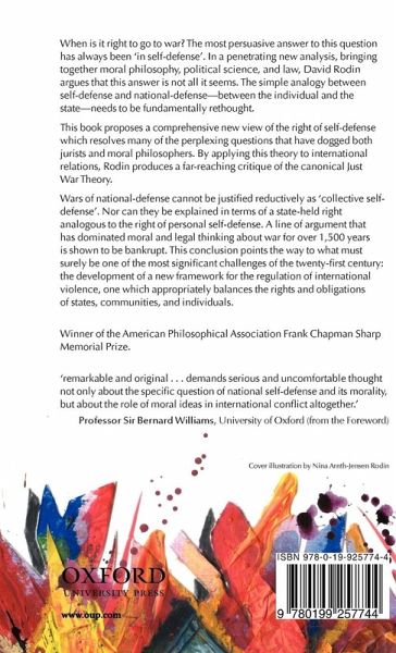 When is it right to go to war? The most persuasive answer to this question has always been 'in self-defense'. In a penetrating new analysis, bringing together moral philosophy, political science, and law, David Rodin shows what's wrong with this answer. He proposes a comprehensive new theory of the right of self-defense which resolves many of the perplexing questions that have dogged both jurists and moral philosophers. By applying the theory of self-defense to international relations, Rodin produces a far-reaching critique of the canonical Just War theory. The simple analogy between self-defense and national defense - between the individual and the state - needs to be fundamentally rethought, and with it many of the basic elements of international law and the ethics of international relations.