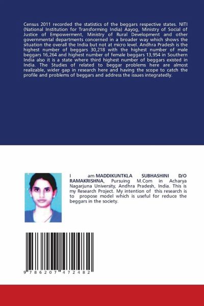 Census 2011 recorded the statistics of the beggars respective states. NITI (National Institution for Transforming India) Aayog, Ministry of Social of Justice of Empowerment, Ministry of Rural Development and other governmental departments concerned in a broader way which shows the situation the overall the India but not at micro level. Andhra Pradesh is the highest number of beggars 30,218 with the highest number of male beggars 16,264 and highest number of female beggars 13,954 in Southern India also it is a state where third highest number of beggars existed in India. The Studies of related to beggar problems here are almost realizable, wider gap in research here and having the scope to catch the profile and problems of beggars and address the issues integratedly.