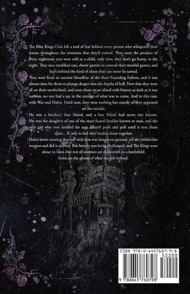 The Elite Kings Club left a trail of fear behind every person who whispered their names throughout the centuries that they'd existed. They were the product of every nightmare you were told as a child, only now, they don't go bump in the night. They race modified cars, throw parties to conceal their morbid games, and leave behind the kind of chaos that can never be tamed. They were from an ancient bloodline of the three Founding Fathers, and it was almost time for them to plunge deeper into the depths of hell. Now that they were all on their motherland, and even closer to an island with history as dark as it was ruthless, no one had a say in the carnage of what was to come. And in this case, with War and Halen. Until now, they were nothing but exactly as they appeared on the outside. He was a brother's best friend, and a boy Halen had never not known. She was the daughter of one of the most feared families known to man, and the only girl who ever kindled his rage. They'd push and pull until it tore them apart...if only to feel the shell of their bodies close. Halen knew crossing that line with him was dangerous ground, yet she yielded her weapon and did it anyway. But history was being challenged, and The Kings were about to learn that not all enemies are discovered on a battlefield. Some are the ghosts of what was left behind.