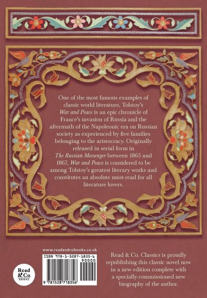 One of the most famous examples of classic world literature, Tolstoy's "War and Peace" is an epic chronicle of France's invasion of Russia and the aftermath of the Napoleonic era on Russian society as experienced by five families belonging to the aristocracy. Originally released in serial form in "The Russian Messenger" between 1865 and 1867, "War and Peace" is considered to be among Tolstoy's greatest literary works and constitutes an absolute must-read for all literature lovers. Count Lev Nikolayevich Tolstoy (1828-1910), also known in English as Leo Tolstoy, was a Russian writer. Generally considered to be one among the greatest novel writers of all time, he was nominated for the Nobel Prize in literature each year between 1902 and 1906; as well as the Nobel Peace Prize in 1901, 1902, and 1910. Other notable works by this author include: "Anna Karenina" (1877), "The Cossacks" (1863), and "Resurrection" (1899). Read & Co. Classics is proudly republishing this classic novel now in a new edition complete with a specially-commissioned new biography of the author.