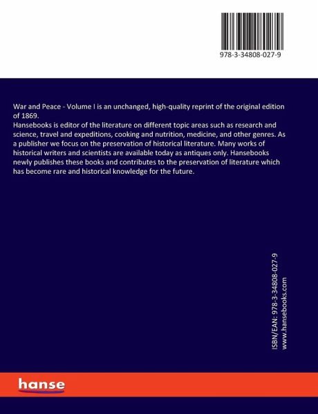 War and Peace - Volume I is an unchanged, high-quality reprint of the original edition of 1869.Hansebooks is editor of the literature on different topic areas such as research and science, travel and expeditions, cooking and nutrition, medicine, and other genres. As a publisher we focus on the preservation of historical literature. Many works of historical writers and scientists are available today as antiques only. Hansebooks newly publishes these books and contributes to the preservation of literature which has become rare and historical knowledge for the future.
