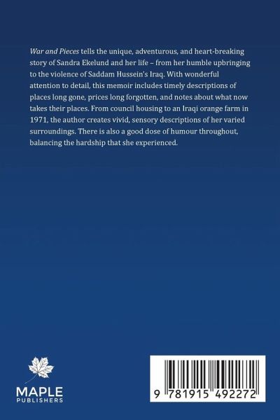 War and Pieces tell the unique, adventurous, and heart-breaking story of Sandra Ekelund and her life - from her humble upbringing to living in the violence of Saddam Hussein's Iraq. With wonderful attention to detail, this memoir includes timely descriptions of places long gone, prices long forgotten, and notes about what now takes their places. From council housing to an Iraqi orange farm in 1971, the author creates vivid, sensory descriptions of her varied surroundings. There is also a good dose of humour throughout, balancing the hardship that she and her children experienced during the years they lived there.