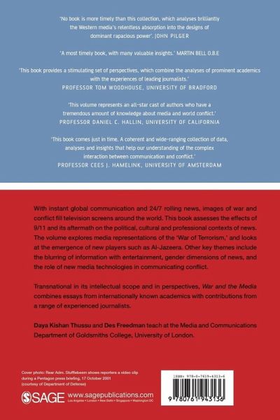 - Philip Taylor Psychological Operations Media During /f003Enduring Freedom PART THREE: REPORTING CONFLICT IN AN ERA OF 24//7 NEWS Live TV and Bloodless Deaths - Daya Kishan Thussu War, Infotainment and 24//7 News Israel//Palestinian Conflict - Greg Philo, Alison Gilmour, Susanna Rust, Etta Gaskell and Lucy West TV News and Public Understanding Mapping the /f003Al-Jazeera/f001 Phenomenon - Noureddine Miladi PART FOUR: REPRESENTATIONS OF CONFLICT - 9//11 AND BEYOND War and the Entertainment Industries - Jonathan Burston New Research Priorities in an Era of Cyber-Patriotism The New Media Environment, Internet Chatrooms and Public Discourse After 9//11 - Bruce A Williams The Media, `War on Terrorism