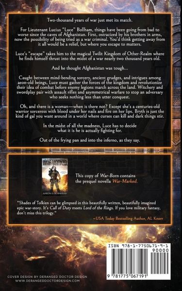 Two-thousand years of war just met its match. For Lieutenant Lucius "Luce" Bollham, things have been going from bad to worse since the caves of Afghanistan. First, ostracized by his brothers in arms, now the possibility of being tried as a war criminal. You'd think getting away from it all would be a relief, but where you escape to matters. Luce's "escape" takes him to the magical Twilit Kingdom of Other-Realm where he finds himself thrust into the midst of a war nearly two thousand years old. And he thought Afghanistan was tough... Caught between mind-bending sorcery, ancient grudges, and intrigues among aeon-old beings, Luce must gather the forces of the kingdom and revolutionize their idea of combat before enemy legions march across the land. Witchery and swordplay pair with assault rifles and asymmetrical warfare to stop an adversary who seeks nothing less than utter conquest. Oh, and there is a woman--when is there not? Except she's a centuries-old warrior-sorceress with blood under her nails and fire on her lips. Bryth is just the kind of gal you want around in a world where curses can kill and dark things stir. In the midst of all the madness, Luce has to decide what it is he is actually fighting for. Out of the frying pan and into the inferno, as they say. "Aaron's writing reminds us that we read for the journey, not the destination. Shades of Tolkien can be glimpsed in this beautifully written, beautifully imagined epic war-story. It's Call of Duty meets Lord of the Rings. If you love military fantasy, don't miss this trilogy." -USA Today Bestselling Author, AL Knorr.