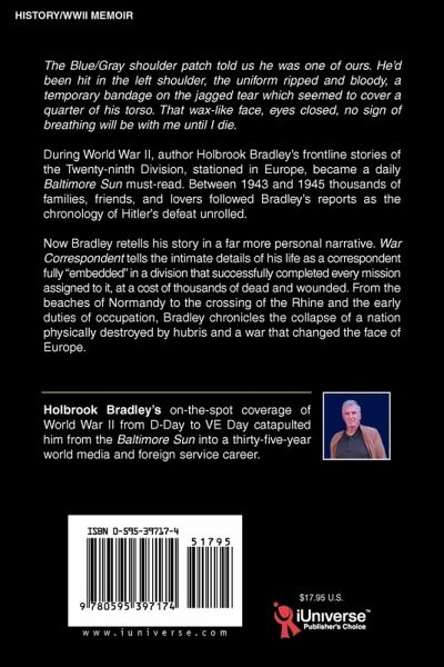 The Blue/Gray shoulder patch told us he was one of ours. He'd been hit in the left shoulder, the uniform ripped and bloody, a temporary bandage on the jagged tear which seemed to cover a quarter of his torso. That wax-like face, eyes closed, no sign of breathing will be with me until I die. During World War II, author Holbrook Bradley's frontline stories of the Twenty-ninth Division, stationed in Europe, became a daily Baltimore Sun must-read. Between 1943 and 1945 thousands of families, friends, and lovers followed Bradley's reports as the chronology of Hitler's defeat unrolled. Now Bradley retells his story in a far more personal narrative. War Correspondent tells the intimate details of his life as a correspondent fully "embedded" in a division that successfully completed every mission assigned to it, at a cost of thousands of dead and wounded. From the beaches of Normandy to the crossing of the Rhine and the early duties of occupation, Bradley chronicles the collapse of a nation physically destroyed by hubris and a war that changed the face of Europe.