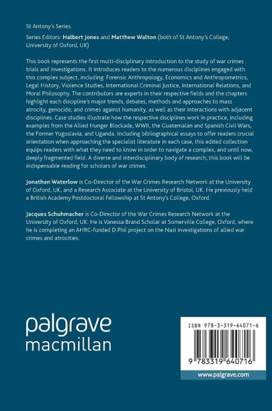 This book represents the first multi-disciplinary introduction to the study of war crimes trials and investigations. It introduces readers to the numerous disciplines engaged with this complex subject, including: Forensic Anthropology, Economics and Anthropometrics, Legal History, Violence Studies, International Criminal Justice, International Relations, and Moral Philosophy. The contributors are experts in their respective fields and the chapters highlight each discipline's major trends, debates, methods and approaches to mass atrocity, genocide, and crimes against humanity, as well as their interactions with adjacent disciplines. Case studies illustrate how the respective disciplines work in practice, including examples from the Allied Hunger Blockade, WWII, the Guatemalan and Spanish Civil Wars, the Former Yugoslavia, and Uganda. Including bibliographical essays to offer readers crucial orientation when approaching the specialist literature in each case, this edited collectionequips readers with what they need to know in order to navigate a complex, and until now, deeply fragmented field. A diverse and interdisciplinary body of research, this book will be indispensable reading for scholars of war crimes.