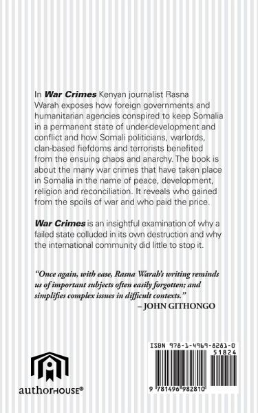 In War Crimes Kenyan journalist Rasna Warah exposes how foreign governments and humanitarian agencies conspired to keep Somalia in a permanent state of under-development and conflict and how Somali politicians, warlords, clan-based fiefdoms and terrorists benefited from the ensuing chaos and anarchy. The book is about the many war crimes that have taken place in Somalia in the name of peace, development, religion and reconciliation. It reveals who gained from the spoils of war and who paid the price. War Crimes is an insightful examination of why a failed state colluded in its own destruction and why the international community did little to stop it.