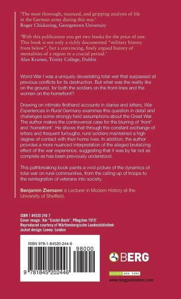 World War I was a uniquely devastating total war that surpassed all previous conflicts for its destruction. But what was the reality like on the ground, for both the soldiers on the front-lines and the women on the homefront?Drawing on intimate firsthand accounts in diaries and letters, War Experiences in Rural Germany examines this question in detail and challenges some strongly held assumptions about the Great War. The author makes the controversial case for the blurring of 'front' and 'homefront'. He shows that through the constant exchange of letters and frequent furloughs, rural soldiers maintained a high degree of contact with their home lives. In addition, the author provides a more nuanced interpretation of the alleged brutalizing effect of the war experience, suggesting that it was by far not as complete as has been previously understood. This pathbreaking book paints a vivid picture of the dynamics of total war on rural communities, from the calling up of troops to the reintegration of veterans into society.