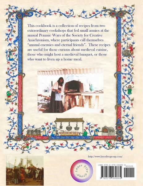 This commemorative, full color, cookbook contains recipes from and remembrances of two people involved in two cook shops which served food during an annual medieval fair in Western Pennsylvania over the course of many years. While not a scholarly work, the book is based on solid research into medieval recipes which have been updated for modern tastes and techniques. The result is a practical cookbook which also contains fun inside information on what it is like to participate in historical re-creation activities in the culinary realm. There are recipes for stews, vegetables, savory and sweet baked goods, breads, drinks, and more. Color covers. Full color interior borders, photographs, and illustrations. 173 pages. A less expensive black and white edition is available entitled simply "War Fare."