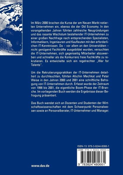 Um die Rekrutierungspraktiken der IT-Unternehmen detailliert zu durchleuchten, führten Afschin Mechkat und Peter Weise in den Jahren 2000 und 2001 eine schriftliche Befragung von IT-Unternehmen durch. Erfasst wurde der Zeitraum von 1998 bis 2001, die eigentliche Boom-Phase der IT-Branche. Im vorliegenden Buch werden die Ergebnisse dieser Befragung präsentiert.