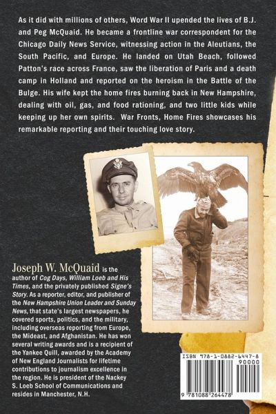 As a World War II newspaper correspondent, B.J. McQuaid covered American and British front lines from the frozen Aleutian Islands of Alaska, to the steaming jungles and seas of the South Pacific, at Tarawa and Guadalcanal and then to Europe from D-Day forward in France, Belgium, Holland, and Germany. He interviewed Sir Bernard Law Montgomery during the Battle of the Bulge and went toe-to-toe with U.S. Third Army General George S. Patton. He was separated from his wife and two small children for three years. He interviewed and got the names of frontline soldiers and sailors, providing a link to their families back home in towns and cities across the United States. His stories ran in more than 80 American newspapers through the Chicago Daily News Service. Peg McQuaid, his wife, was keeping the Home Fires burning back in New Hampshire, providing for herself and their two small children. She dealt with food, oil, and gasoline rationing while writing faithfully and regularly to her husband overseas. Theirs is a story of love, of sacrifice, and of hope. Even 80 years after D-Day in Europe, it will still resonate with many Americans.