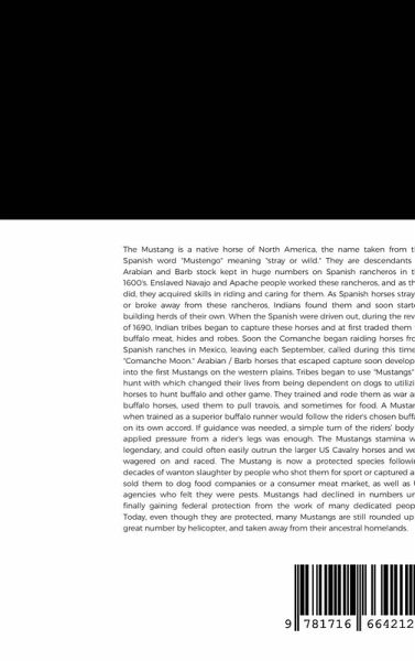 A Buffalo runner was the toughest, big hearted little horse to have ever lived, truly an amazing animal. The Spanish mustang trained to chase a herd of Bison, or single buffalo cows or bulls without direction, as the Indian rider sat bareback or on a pad saddle with hands free in order to fire an arrow or throw a lance at the Buffalo, stayed the course without guidance, only his training kept him on target. These horses were invaluable when trained and could not be had for any amount of money, except perhaps a white buffalo robe that was considered nearly priceless. They have earned a place in history as a western icon but many of these sturdy fleet footed strong horses are still rounded up, chased by helicopter until deathly exhausted before being loaded into trucks then taken to an unfamiliar place, even though they had received federal protection. Do these small but mighty horses deserve such a fate or do they deserve the respect of having earned a place in our country's history? They have earned the right to run free over the plains as they have for well over three hundred years. These horses, not unlike other plains animals, according to biologists, do not reproduced as fast as they are accused of doing since herd sizes are determined through acts of nature, as it should be. Deer, antelope, and other grass eaters are not treated this way that is because of the argument that the horse is not a native species. Horses did evolve in the United States. Tiny little Eohippus does not look like today's horses, but it did originate in the western parts of what is now the US making horses a natural species. To argue they are not is ignoring evidence, and basing the ancestors of little Eohippus solely on looks. Many scientists and some archaeologist feel the same way. I hope reading this information, will lead to a more complete history of the importance of these sturdy mustangs'. Hopefully people will be encouraged to write their congressmen and women to ensure they remain protected. We owe that to our children and grandchildren so they understand the importance that this strong little mustang had to the native people of this land.