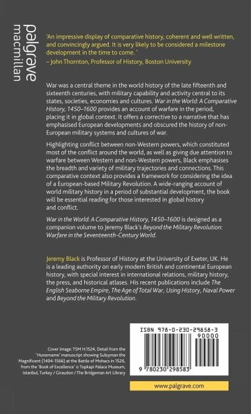War was a central theme in the world history of the late fifteenth and sixteenth centuries, with military capability and activity central to its states, societies, economies and cultures. War in the World 1450-1600 provides an account of warfare in the period, placing it in global context. It offers a corrective to a narrative that has emphasised European developments and obscured the history of non-European military systems and cultures of war. Highlighting conflict between non-Western powers, which constituted most of the conflict around the world, as well as giving due attention to warfare between Western and non-Western powers, Black emphasises the breadth and variety of military trajectories and connections. This comparative context also provides a framework for considering the idea of a European-based Military Revolution. A wide-ranging account of world military history in a period of substantial development, the book will be essential reading for those interested in global history and conflict. War in the World 1450-1600 is designed as a companion volume to Jeremy Black's Beyond the Military Revolution: Warfare in the Seventeenth-Century World.