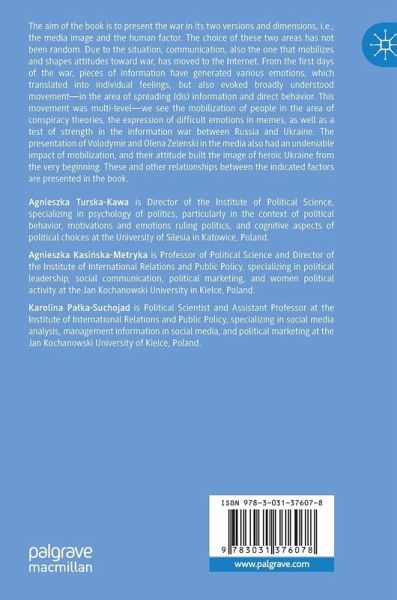 The aim of the book is to present the war in its two versions and dimensions, i.e., the media image and the human factor. The choice of these two areas has not been random. Due to the situation, communication, also the one that mobilizes and shapes attitudes toward war, has moved to the Internet. From the first days of the war, pieces of information have generated various emotions, which translated into individual feelings, but also evoked broadly understood movement-in the area of spreading (dis) information and direct behavior. This movement was multi-level-we see the mobilization of people in the area of conspiracy theories, the expression of difficult emotions in memes, as well as a test of strength in the information war between Russia and Ukraine. The presentation of Volodymir and Olena Zelenski in the media also had an undeniable impact of mobilization, and their attitude built the image of heroic Ukraine from the very beginning. These and other relationships between the indicated factors are presented in the book.