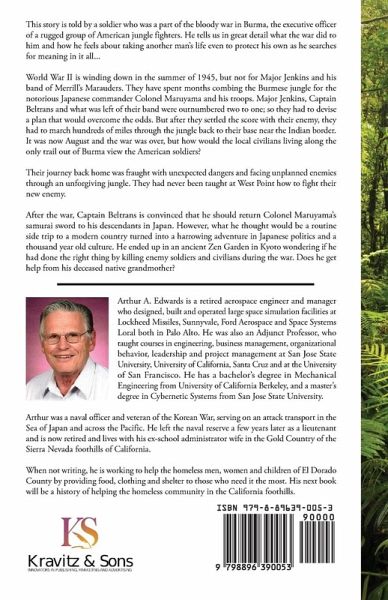 This story is told by a soldier who was a part of the bloody war in Burma, the executive officer of a rugged group of American jungle fighters. He tells us in great detail what the war did to him and how he feels about taking another man's life even to protect his own as he searches for meaning in it all...World War II is winding down in the summer of 1945, but not for Major Jenkins and his band of Merrill's Marauders. They have spent months combing the Burmese jungle for the notorious Japanese commander Colonel Maruyama and his troops. Major Jenkins, Captain Beltrans and what was left of their band were outnumbered two to one; so they had to devise a plan that would overcome the odds. But after they settled the score with their enemy, they had to march hundreds of miles through the jungle back to their base near the Indian border. It was now August and the war was over, but how would the local civilians living along the only trail out of Burma view the American soldiers?Their journey back home was fraught with unexpected dangers and facing unplanned enemies through an unforgiving jungle. They had never been taught at West Point how to fight their new enemy.After the war, Captain Beltrans is convinced that he should return Colonel Maruyama's samurai sword to his descendants in Japan. However, what he thought would be a routine side trip to a modern country turned into a harrowing adventure in Japanese politics and a thousand year old culture. He ended up in an ancient Zen Garden in Kyoto wondering if he had done the right thing by killing enemy soldiers and civilians during the war. Does he get help from his deceased native grandmother?