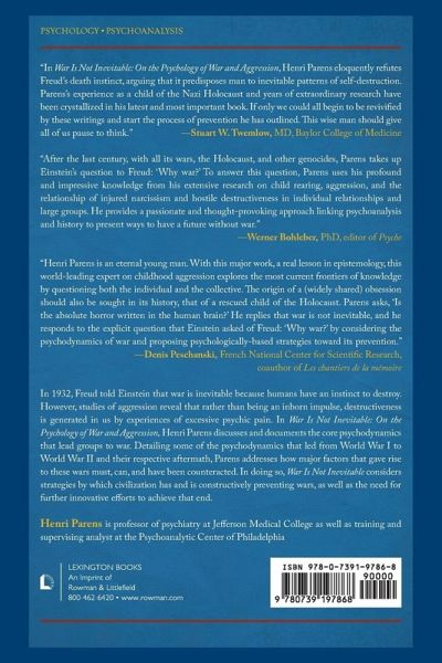 In 1932 Einstein asked Freud, 'Is there any way of delivering mankind from the menace of war?' Freud answered that war is inevitable because humans have an instinct to self-destroy, a death instinct which we must externalize to survive. But nearly four decades of study of aggression reveal that rather than being an inborn drive, destructiveness is generated in us by experiences of excessive psychic pain. In War is Not Inevitable: On the Psychology of War and Aggression, Henri Parens argues that the death-instinct based model of aggression can neither be proved nor disproved as Freud's answer is untestable. By contrast, the 'multi-trends theory of aggression' is provable and has greater heuristic value than does a death-instinct based model of aggression. When we look for causes for war we turn to history as well as national, ethnic, territorial, and or political issues, among many others, but we also tend to ignore the psychological factors that play a large role. Parens discusses such psychological factors that seem to lead large groups into conflict. Central among these are the psychodynamics of large-group narcissism. Interactional conditions stand out: hyper-narcissistic large-groups have, in history, caused much narcissistic injury to those they believe they are superior to. But this is commonly followed by the narcissistically injured group's experiencing high level hostile destructiveness toward their injury-perpetrator which, in time, will compel them to revenge. Among groups that have been engaged in serial conflicts, wars have followed from this psychodynamic narcissism-based cyclicity. Parens details some of the psychodynamics that led from World War I to World War II and their respective aftermath, and he addresses how major factors that gave rise to these wars must, can, and have been counteracted. In doing so, Parens considers strategies by which civilization has and is constructively preventing wars, as well as the need for further innovative efforts to achieve that end.