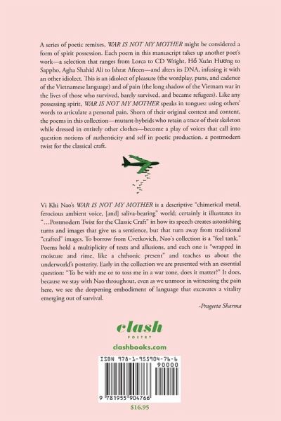 A series of poetic remixes, WAR IS NOT MY MOTHER might be considered a form of spirit possession. Each poem in this manuscript takes up another poet's work- a selection that ranges from Lorca to CD Wright, Hồ Xuân Hương to Sappho, Agha Shahid Ali to Ishrat Afreen? and alters its DNA, infusing it with an other idiolect. This is an idiolect of pleasure (the wordplay, puns, and cadence of the Vietnamese language) and of pain (the long shadow of the Vietnam war in the lives of those who survived, barely survived, and became refugees). Like any possessing spirit, WAR IS NOT MY MOTHER speaks in tongues: using others' words to articulate a personal pain. Shorn of their original context and content, the poems in this collection? mutant-hybrids who retain a trace of their skeleton while dressed in entirely other clothes? become a play of voices that call into question notions of authenticity and self in poetic production, a postmodern twist for the classical craft.