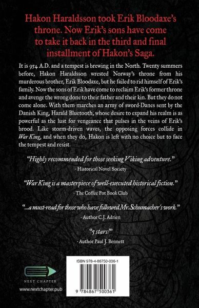Hakon Haraldsson took their father's throne. Now the sons of Erik Bloodaxe have come to get it back. It is 954 A.D. and a tempest is brewing in the North. Twenty summers before, Hakon Haraldsson wrested Norway's throne from his murderous brother, Erik Bloodaxe, but he failed to rid himself of Erik's family. Now the sons of Erik have come to reclaim Erik's realm and avenge the wrong done to their father and their kin. They do not come alone. With them marches an army of sword-Danes sent by the Danish King, Harald Bluetooth, whose desire to expand his realm is as powerful as the lust for vengeance that pulses in the veins of Erik's brood. Like storm-driven waves, the opposing forces collide in War King, the action-packed sequel to God's Hammer and Raven's Feast.