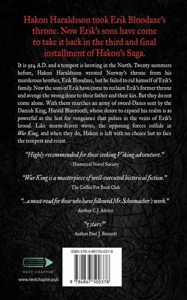 Hakon Haraldsson took their father's throne. Now the sons of Erik Bloodaxe have come to get it back. It is 954 A.D. and a tempest is brewing in the North. Twenty summers before, Hakon Haraldsson wrested Norway's throne from his murderous brother, Erik Bloodaxe, but he failed to rid himself of Erik's family. Now the sons of Erik have come to reclaim Erik's realm and avenge the wrong done to their father and their kin. They do not come alone. With them marches an army of sword-Danes sent by the Danish King, Harald Bluetooth, whose desire to expand his realm is as powerful as the lust for vengeance that pulses in the veins of Erik's brood. Like storm-driven waves, the opposing forces collide in War King, the action-packed sequel to God's Hammer and Raven's Feast.