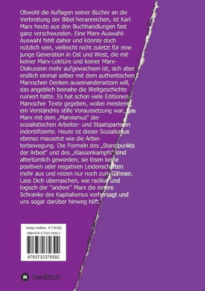 Obwohl die Auflagen seiner Bücher an die Verbreitung der Bibel heranreichen, ist Karl Marx heute aus den Buchhandlungen fast ganz verschwunden. Eine Marx-Auswahl-Auswahl fehlt daher und könnte doch nützlich sein, vielleicht nicht zuletzt für eine junge Generation in Ost und West, die mit keiner Marx-Lektüre und keiner Marx-Diskussion mehr aufgewachsen ist, sich aber endlich einmal selber mit dem authentischen Marxschen Denken auseinandersetzen will, das angeblich beinahe die Weltgeschichte ruiniert hätte. Es hat schon viele Editionen Marxscher Texte gegeben, wobei meistens ein Verständnis stille Voraussetzung war, das Marx mit dem "Marxismus" der sozialistischen Arbeiter- und Staatsparteien indentifizierte. Heute ist dieser Sozialismus ebenso mausetot wie die Arbeiterbewegung. Die Formeln des "Standpunkts der Arbeit" und des "Klassenkampfs" sind altertümlich geworden; sie lösen keine positiven oder negativen Leidenschaften mehr aus und reizen nur noch zum Gähnen. Lass Dich überraschen von der Radikalität und Logik des "anderen" Marx, der bis an die Innere Schranke des Kapitalismus dachte und sogar darüber hinaus.