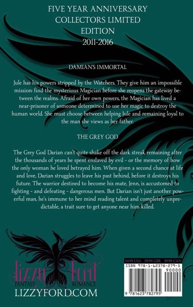 Collector's edition available for a limited time in celebration of the five year anniversary of the launch of the War of Gods series. Includes: "Damian's Immortal" and "The Grey God" Damian's Immortal Jule has his powers stripped by the Watchers. They give him an impossible mission: find the mysterious Magician before she reopens the gateway between the realms. Afraid of her own powers, the Magician has lived a near-prisoner of someone determined to use her magic to destroy the human world. She must choose between helping Jule and remaining loyal to the man she views as her father. The Grey God The Grey God Darian can’t quite shake off the dark streak remaining after the thousands of years he spent enslaved by evil – or the memory of how the only woman he loved betrayed him. When given a second chance at life and love, Darian struggles to leave his past behind, before it destroys his future. The warrior destined to become his mate, Jenn, is accustomed to fighting – and defeating – dangerous men. But Darian isn’t just another powerful man, he’s immune to her mind reading talent and completely unpredictable, a trait sure to get anyone near him killed.