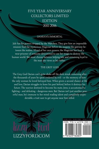 Collector's edition available for a limited time in celebration of the five year anniversary of the launch of the War of Gods series. Includes: "Damian's Immortal" and "The Grey God" Damian's Immortal Jule has his powers stripped by the Watchers. They give him an impossible mission: find the mysterious Magician before she reopens the gateway between the realms. Afraid of her own powers, the Magician has lived a near-prisoner of someone determined to use her magic to destroy the human world. She must choose between helping Jule and remaining loyal to the man she views as her father. The Grey God The Grey God Darian can’t quite shake off the dark streak remaining after the thousands of years he spent enslaved by evil – or the memory of how the only woman he loved betrayed him. When given a second chance at life and love, Darian struggles to leave his past behind, before it destroys his future. The warrior destined to become his mate, Jenn, is accustomed to fighting – and defeating – dangerous men. But Darian isn’t just another powerful man, he’s immune to her mind reading talent and completely unpredictable, a trait sure to get anyone near him killed.