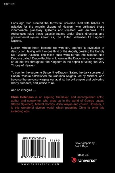 Eons ago God created the terrestrial universe filled with billions of galaxies for the Angelic citizens of Heaven, who cultivated these innumerable planetary systems and created vast empires. The Archangels ruled these galactic realms under God's directives and governmental system known as, The United Federation Of Kingdom Nations. Lucifer, whose heart became rot with sin, sparked a revolution of destruction, taking with him one third of the Angels, creating the Unholy Six Galactic Alliance. The fallen ones were turned into hideous Red Dragons called, Draco-Reptilians, known as the Draconians, who waged an all out war throughout the Kingdom in the hopes of taking the very Throne of Heaven. To counter the supreme Serpentine-Dragon, Satan, the dark sorcerer of Rahab, Yeshua established the Guardian Knights, led by Michael, who traverse the universe waging war against the evil empire and delivering liberty, freedom, and justice to all. And so it begins...