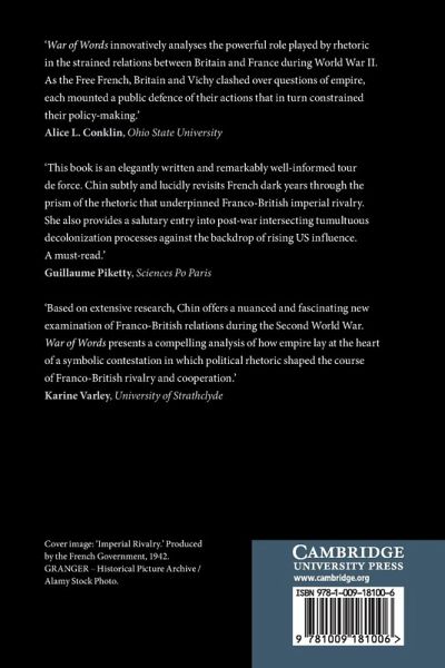 War of Words analyses Franco-British relations during the Second World War through the lens of rhetoric and empire. Through a comparative and transnational perspective, Rachel Chin shows how conflicts over French colonial territory between 1940 and 1945 were central to British, Vichy and Free French wartime policy-making.