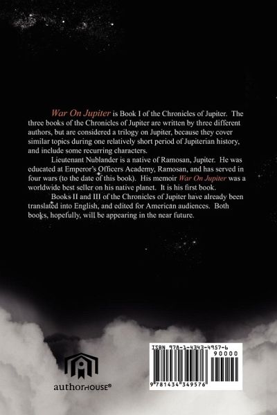 War On Jupiter is Book I of the Chronicles of Jupiter. The three books of the Chronicles of Jupiter are written by three different authors, but are considered a trilogy on Jupiter, because they cover similar topics during one relatively short period of Jupiterian history, and include some recurring characters. Lieutenant Nublander is a native of Ramosan, Jupiter. He was educated at Emperor's Officers Academy, Ramosan, and has served in four wars (to the date of this book). His memoir War On Jupiter was a worldwide best seller on his native planet. It is his first book. Books II and III of the Chronicles of Jupiter have already been translated into English, and edited for American audiences. They will be appearing soon, D. V.