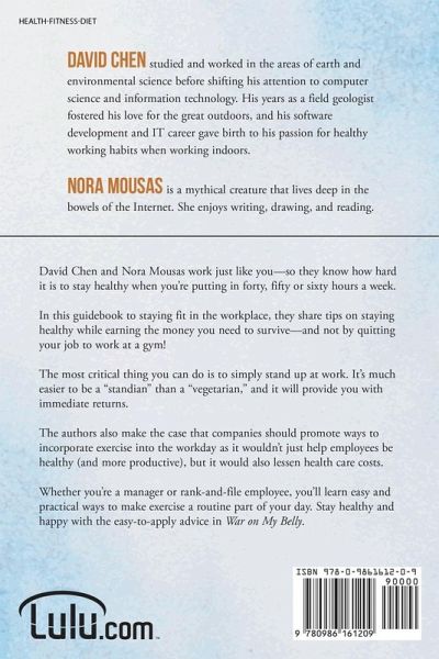 David Chen and Nora Mousas work just like you-so they know how hard it is to stay healthy when you're putting in forty, fifty or sixty hours a week. In this guidebook to staying fit in the workplace, they share tips on staying healthy while earning the money you need to survive-and not by quitting your job to work at a gym! The most critical thing you can do is to simply stand up at work. It's much easier to be a "standian" than a "vegetarian," and it will provide you with immediate returns. The authors also make the case that companies should promote ways to incorporate exercise into the workday as it wouldn't just help employees be healthy (and more productive), but it would also lessen health care costs. Whether you're a manager or rank-and-file employee, you'll learn easy and practical ways to make exercise a routine part of your day. Stay healthy and happy with the easy-to-apply advice in War on My Belly.